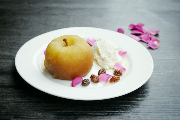 法式甜品中有道紅酒燉洋梨,改用玫瑰紅茶也同樣美味。將蘋果浸在茶中再燉,充滿玫瑰花香,蘋果吸收了茶的精華,煮過的蘋果充滿茶香,健康,低卡又美味。再配上鮮奶油,冰淇淋或優格享用,便成簡易快捷又美味的甜點。
