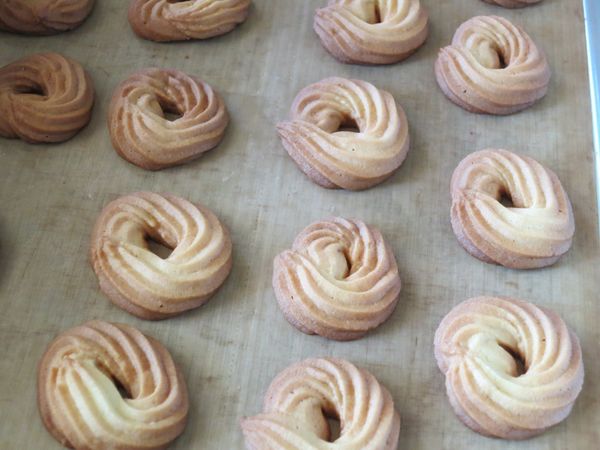 1.備妥材料2.3.室溫軟化的奶油+糖粉低速打勻4.5.分3-4次加入蛋液中高速打勻6.7.8各加入粉類用刮刀切拌方式拌勻9.裝入擠花袋在烤盤擠圈,或自己想要購圖,烤箱預熱170