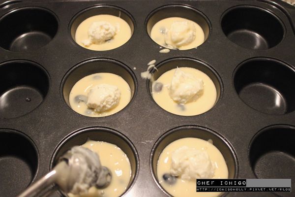 拌入小藍莓, 分裝在模子裡 ( 先裝一半的麵糊, 放上一小球打發的奶油乳酪內餡, 再倒入另一半的麵糊)
