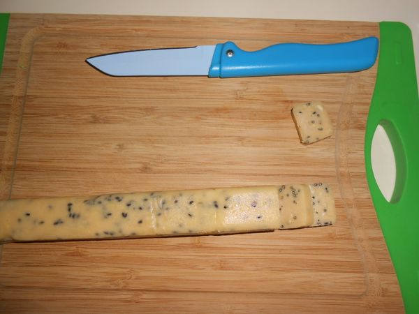 要烤時先180度預熱烤箱,預熱時把變硬的麵團用水果刀切成0.6~0.7公分厚度