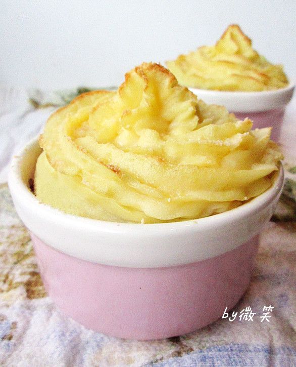 擠上或舀入適量的馬鈴薯泥覆蓋表面,最後灑上ㄧ點乳酪粉來增香,入預熱好的烤箱用200度烤到表面呈微黃色既完成